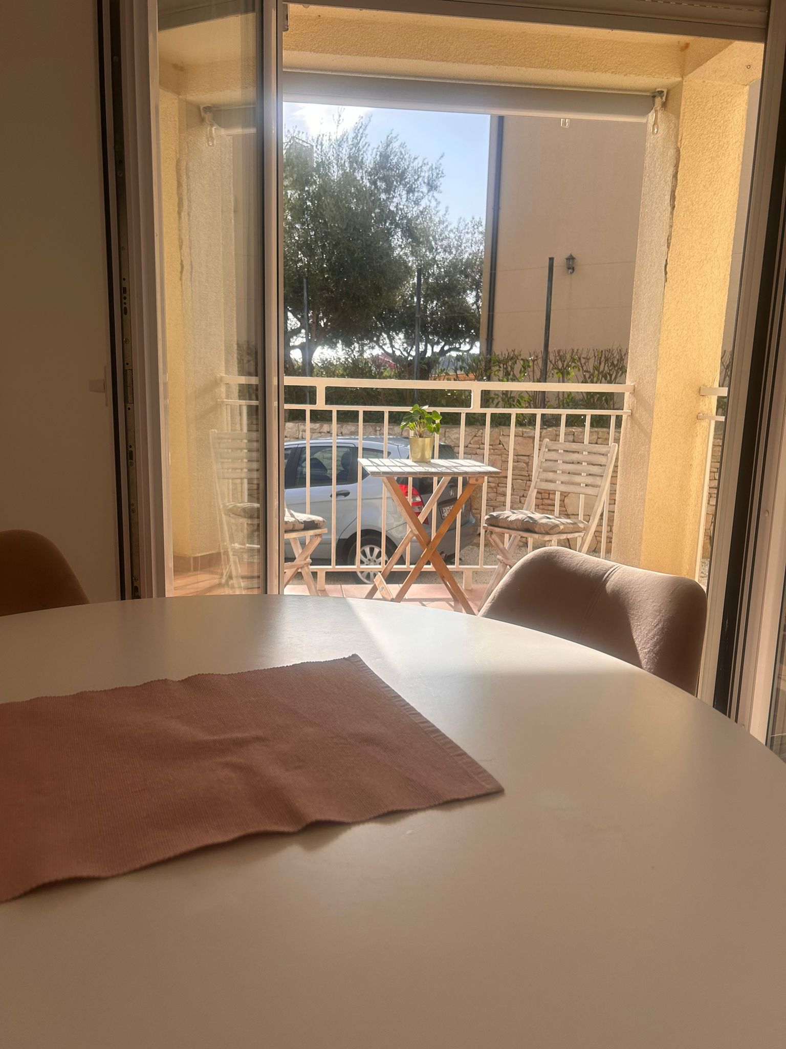 The building has a lovely shared garden at the entrance, and the apartment comes with its own parking space.